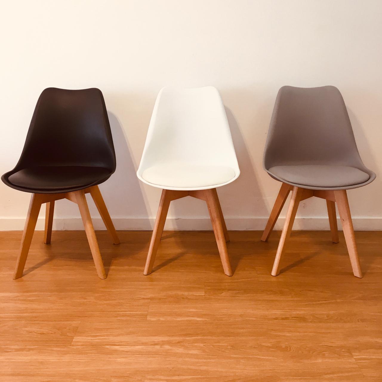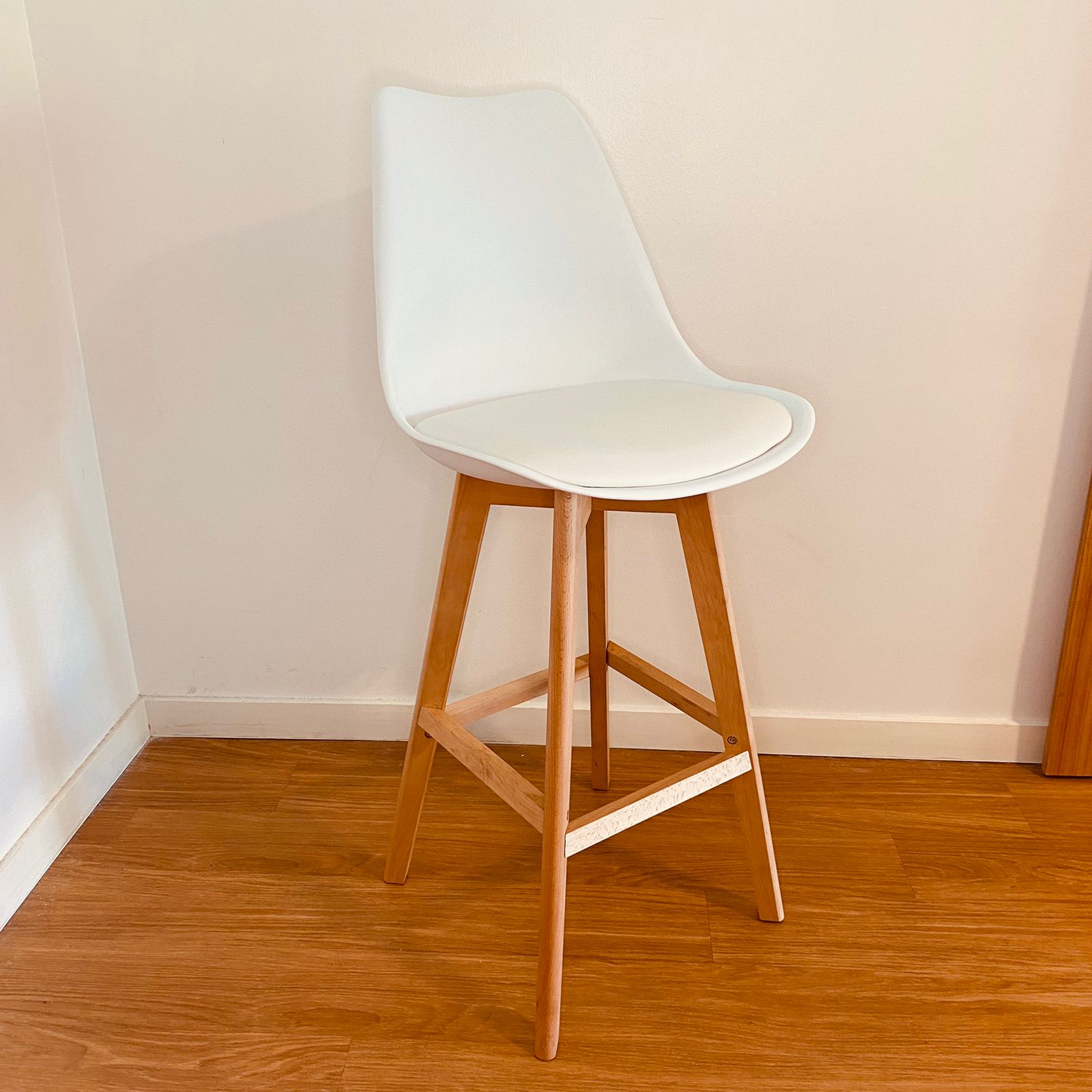 ✔️Colores blanco / negro ✔️Cuerpo de polipropileno ✔️Patas de madera haya ✔️Asiento acolchonado de eco cuero ✔️Altura al asiento 73cm ✔️Altura máxima del respaldo 109cm ✔️Ancho máximo 48cm